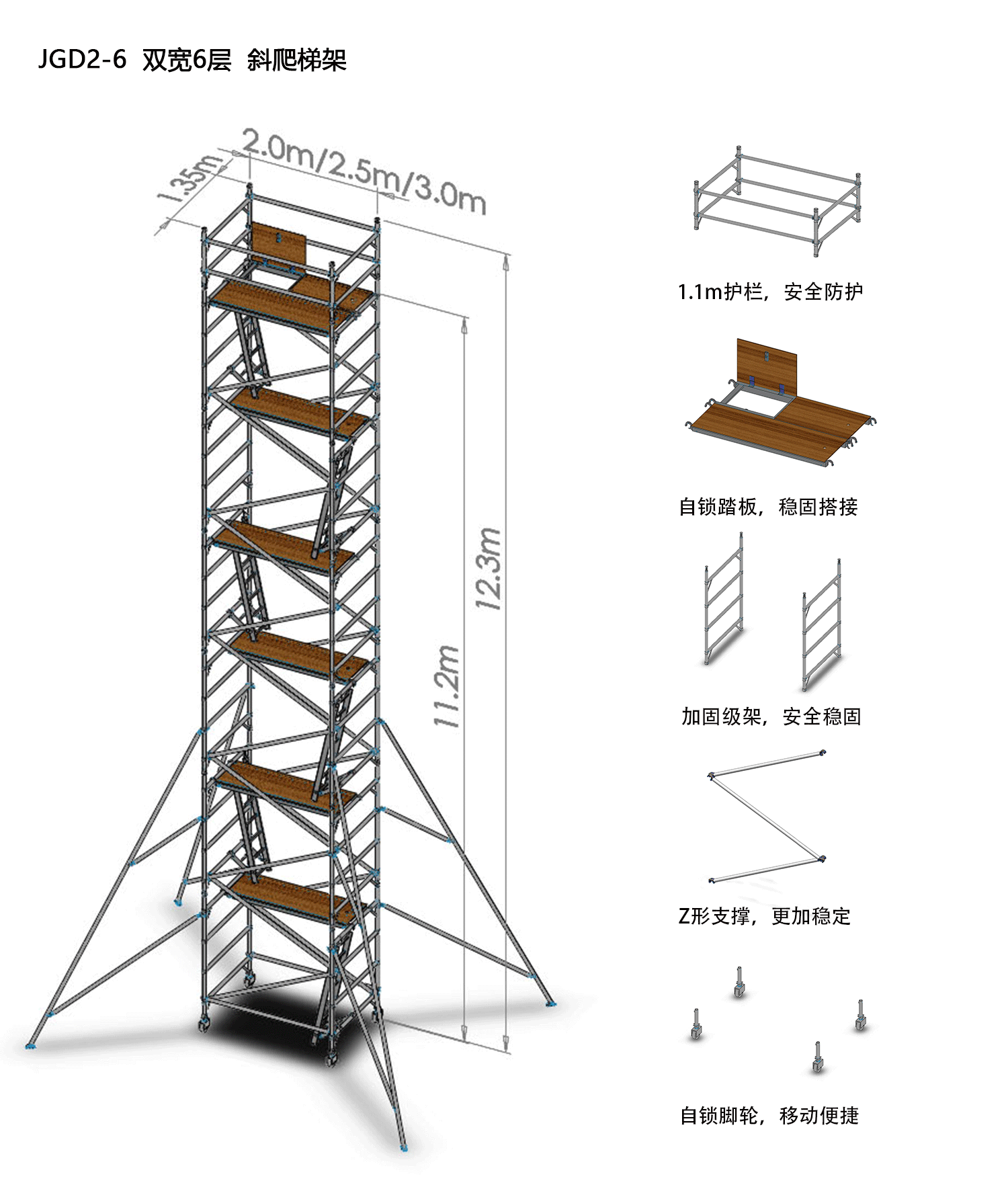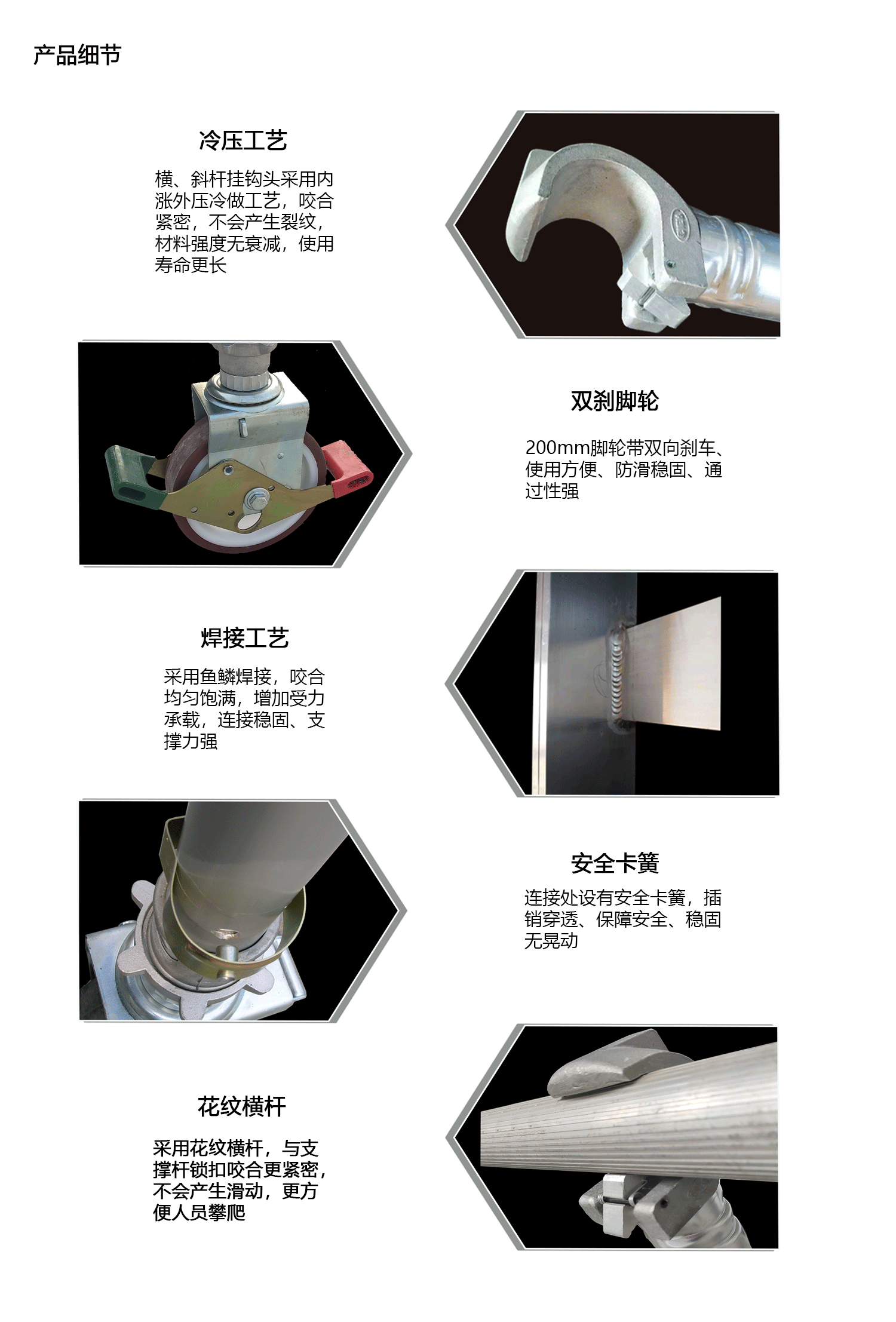 主要特點(diǎn):主材采用6系列特選鋁合金,重量輕、強(qiáng)度高、免維護(hù)、快捷方便;單體工作高度可達(dá)18米。這種移動(dòng)腳手架易于運(yùn)輸,使用標(biāo)準(zhǔn)部件搭建,層級(jí)464mm,可快速組裝至工作高度,配備有可移動(dòng)并可鎖定腳輪,配合外支撐桿安全固定,可以根據(jù)情況單獨(dú)或搭配使用;使用時(shí)無(wú)需借助任何工具。