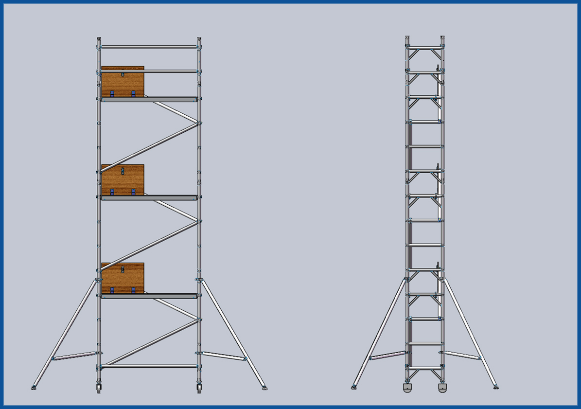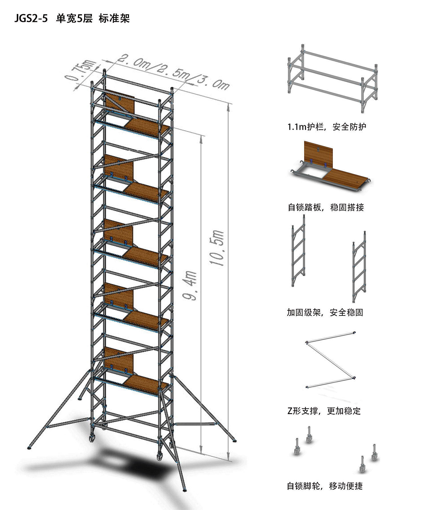 架易于運(yùn)輸,使用標(biāo)準(zhǔn)部件搭建,層級(jí)464mm,可快速組裝至工作高度,配備有可移動(dòng)并可鎖定腳輪,配合外支撐桿安